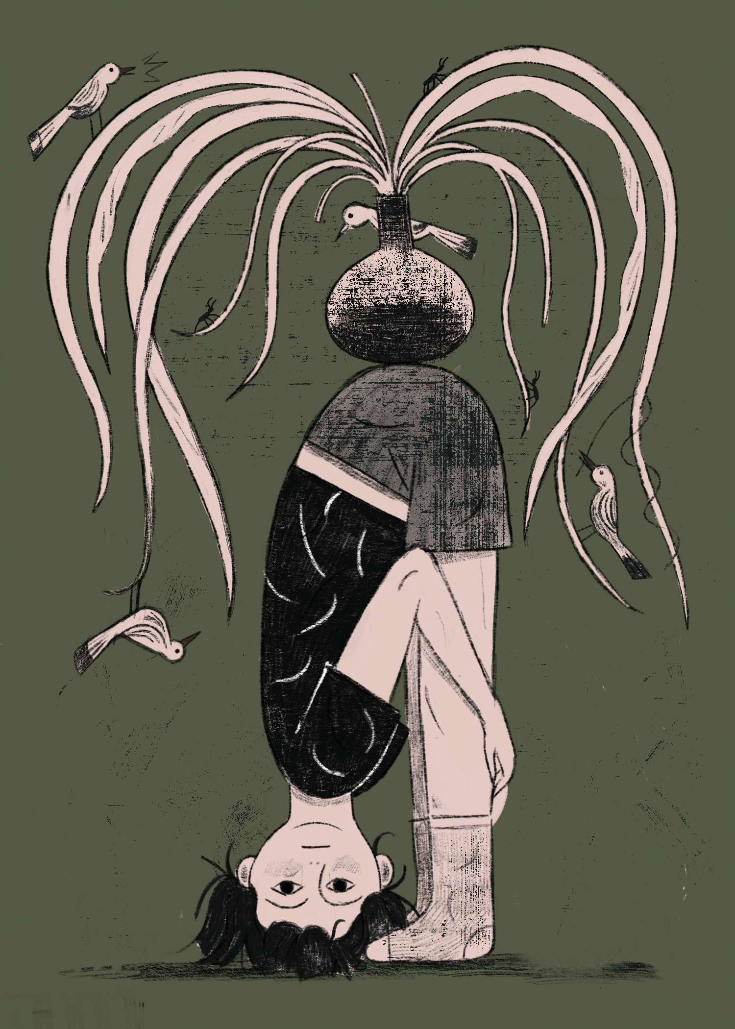 Illustration de quatre personnages avec des éléments naturels : un arbre avec des yeux et une bûche, un fantôme avec des chaussures, un nuage avec un visage solaire, un cheval.