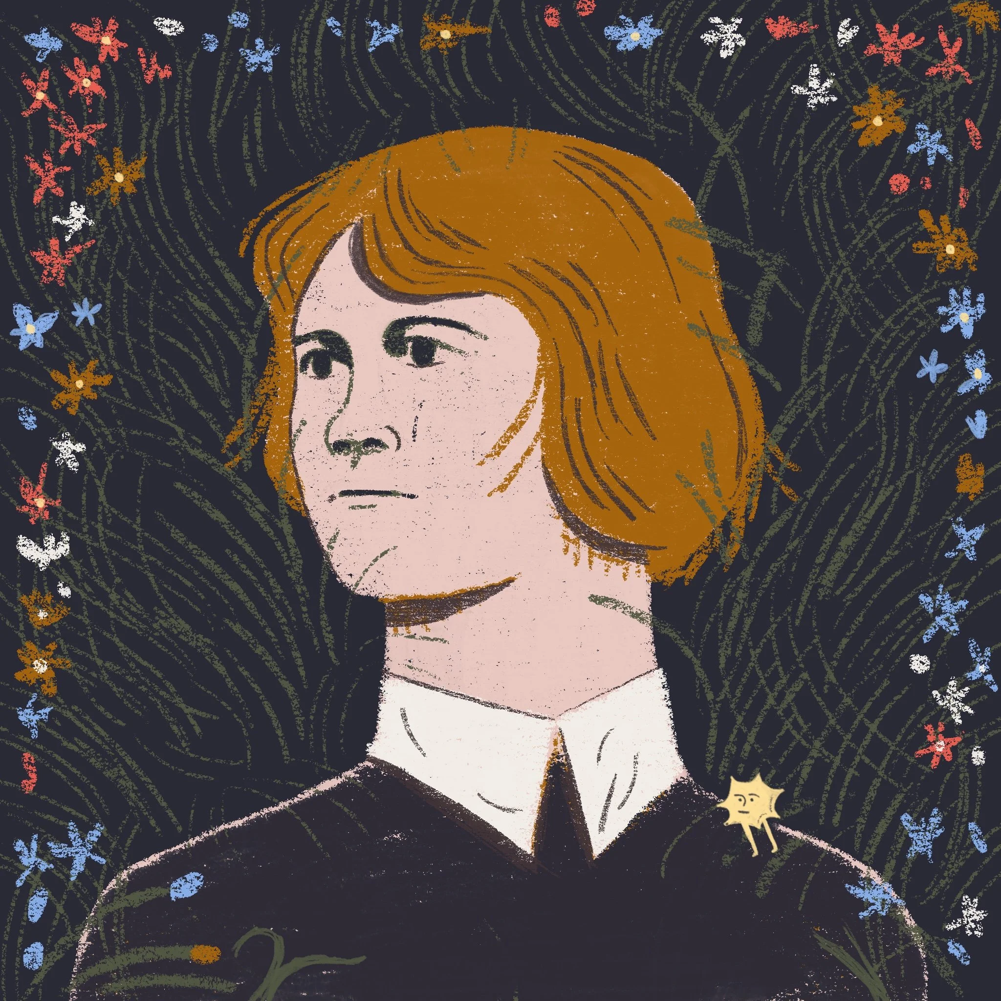 Portrait d'une femme avec des cheveux bruns, portant une robe noire avec un col blanc, entourée de fleurs colorées sur un fond noir.