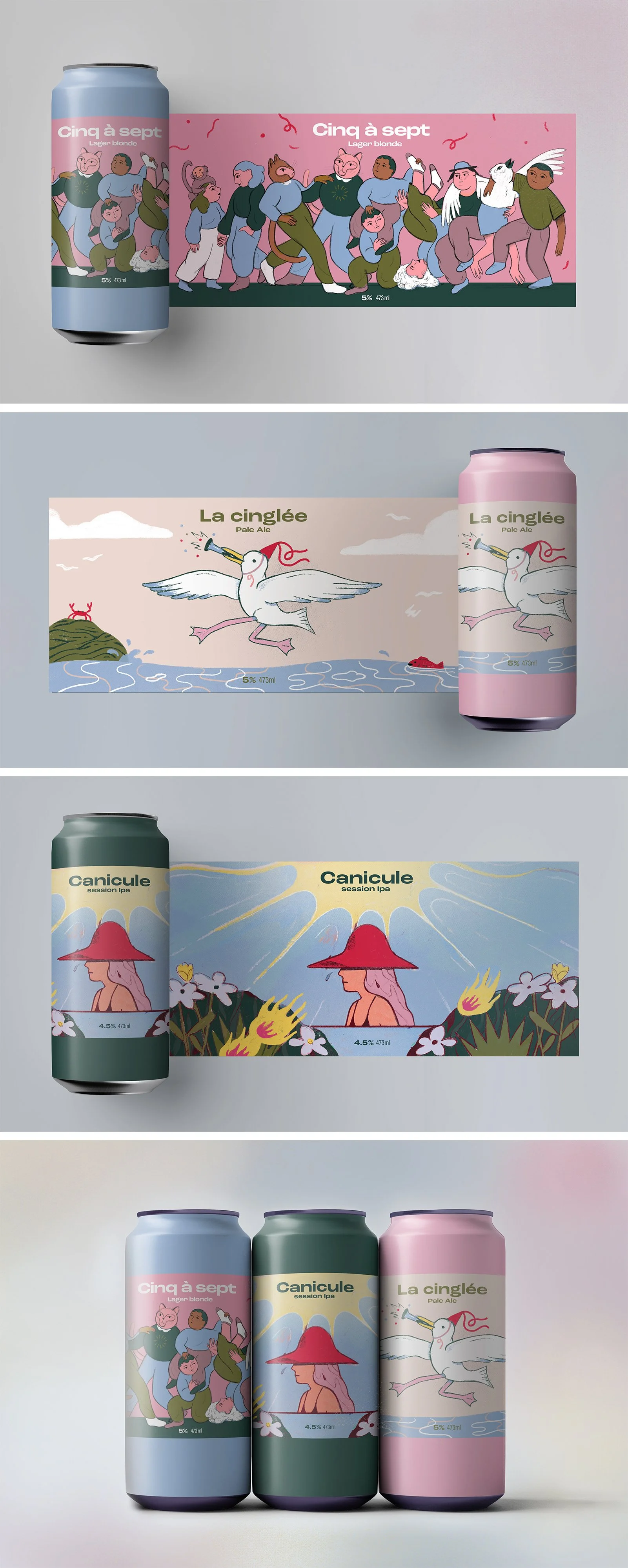 Trois canettes de bière avec des étiquettes illustrées distinctes. La première montre un groupe de personnes dansantes, la seconde une oie portant une trompette, la troisième une femme portant un chapeau rouge sous un soleil. Le fond est neutre et la