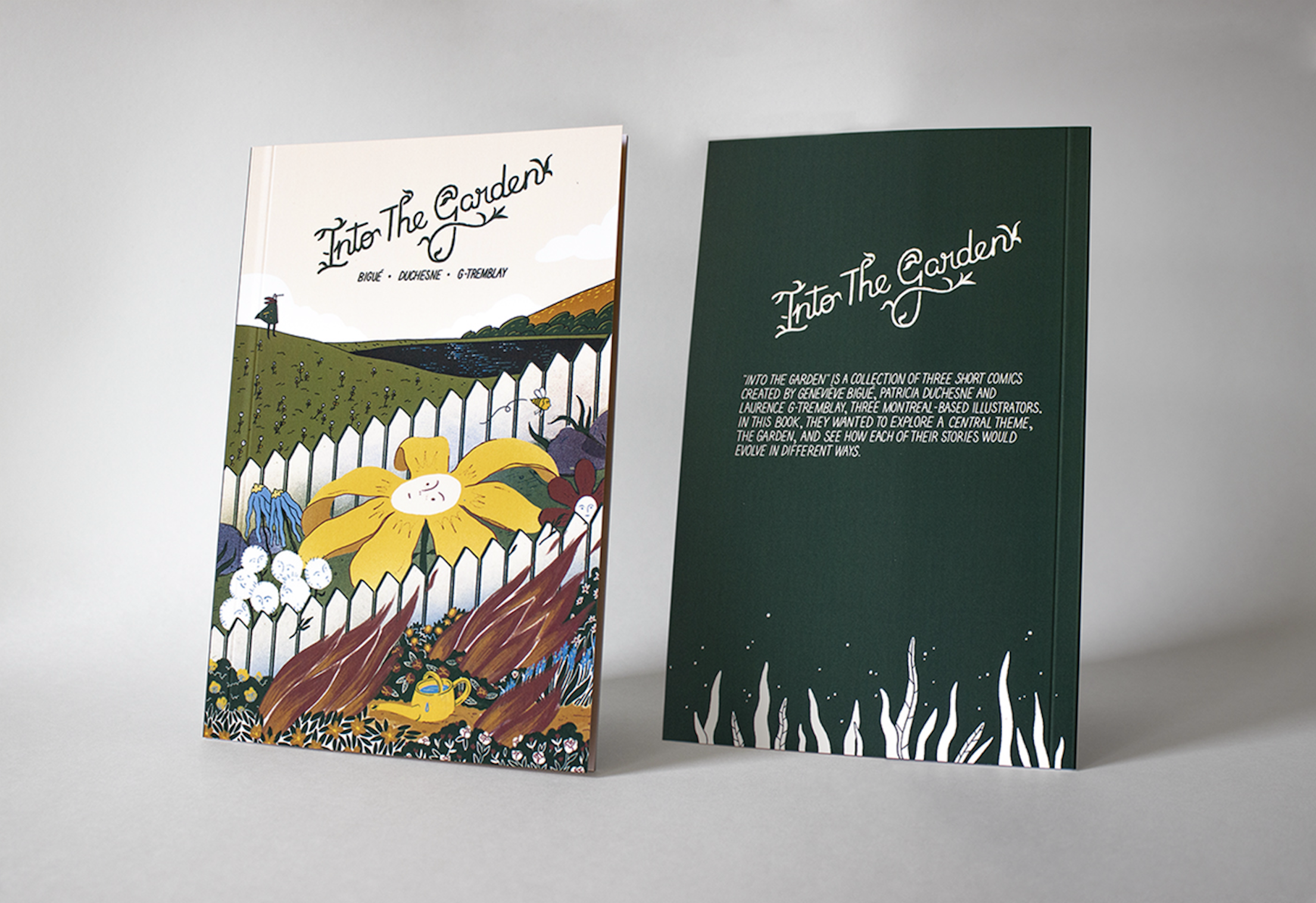 Deux livres posés sur une surface blanche, l'un avec une couverture illustrée d'un jardin avec des fleurs et une clôture en bois et l'autre avec une couverture verte avec du texte.