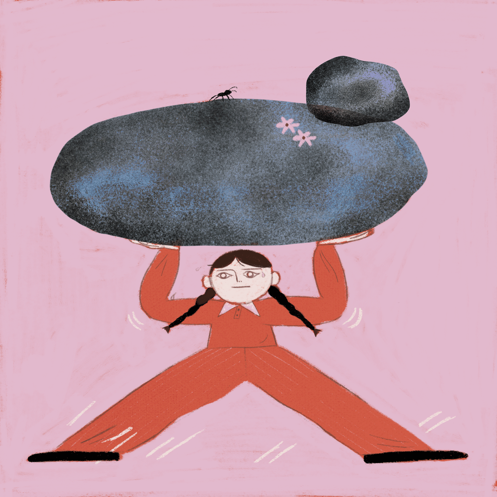 Une fille debout, portant une grande pierre noire sur la tête, avec un fond rose.